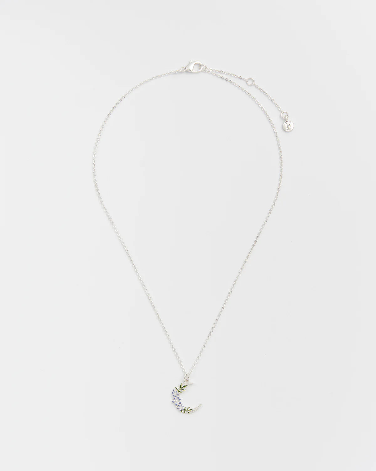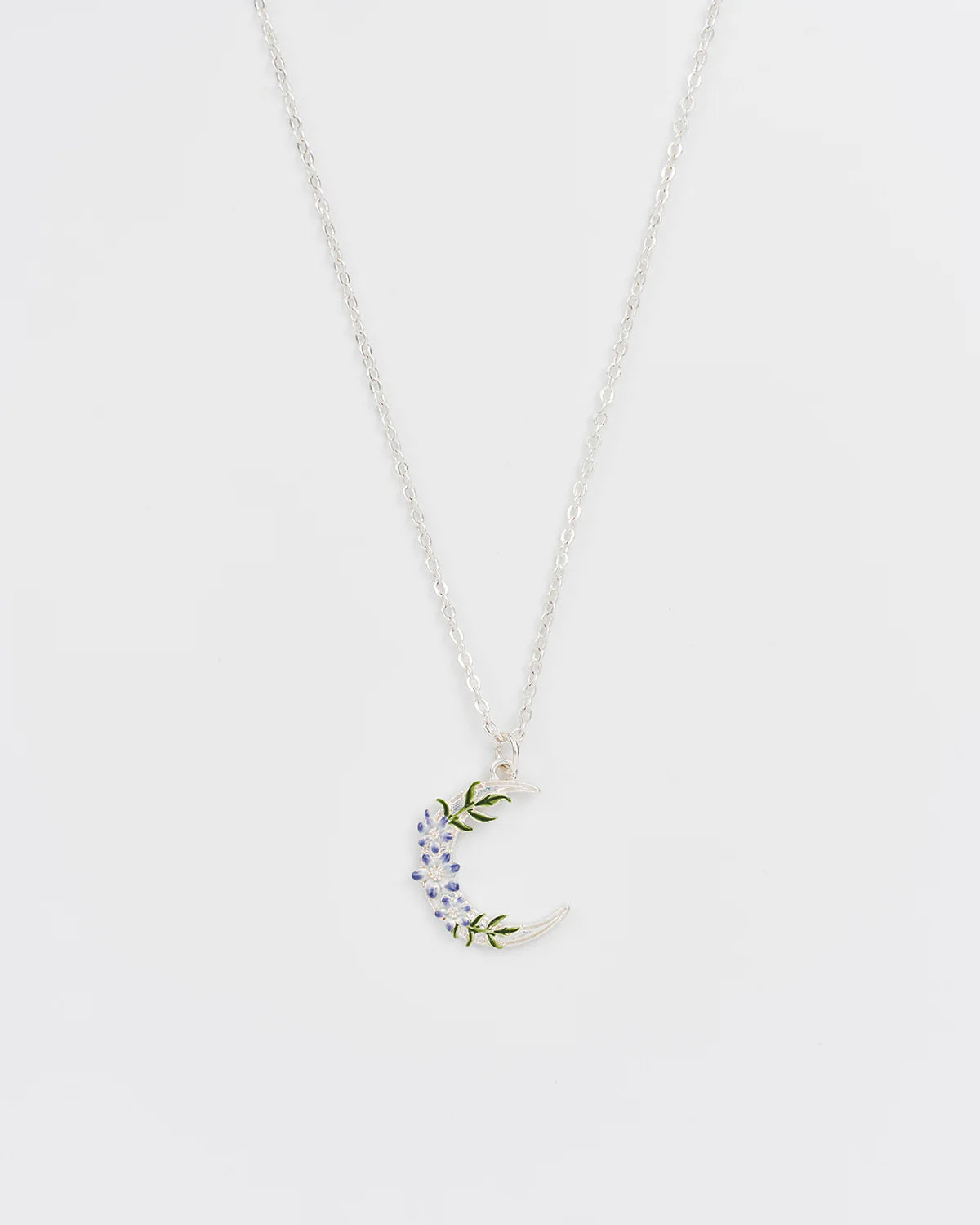 A koptatott sterling ezüstözött sárgarézből készült, kézzel festett zománccal díszített medálon apró kis virágok helyezkednek el holdsarló alakban - a misztikum és a megújulás szimbólumaként.