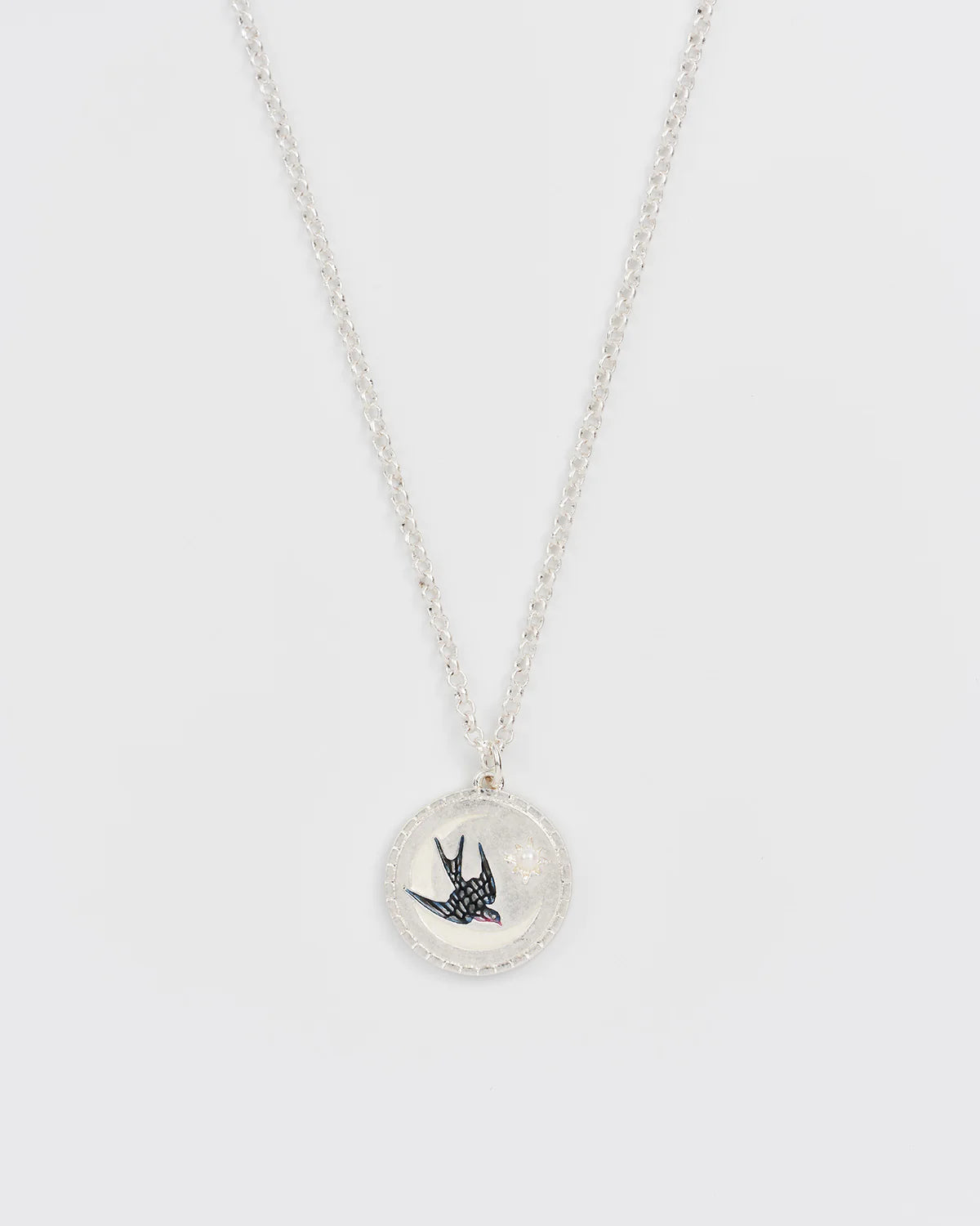 A zománccal, kézzel festett fecske madárka egy koptatott ezüstözött sárgaréz korongon száll, a Nap és a Hold égi szimbólumai kíséretében - időtlen emlékeztetőként arra, hogy mindig vigyáznak rád, még az élet legcsendesebb óráiban is...