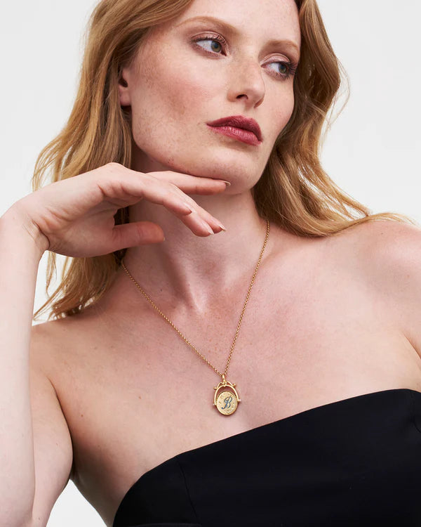 Ez a vintage stílusú aranyozott nyaklánc forgatható medállal egy különleges darab, amely jelentőségteljes ajándék vagy személyes emléktárgy lehet annak, aki viseli.