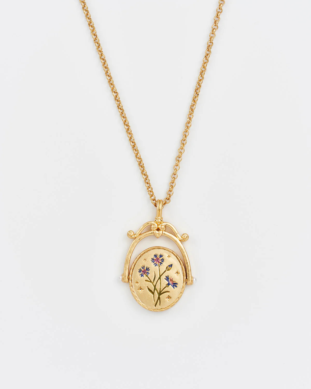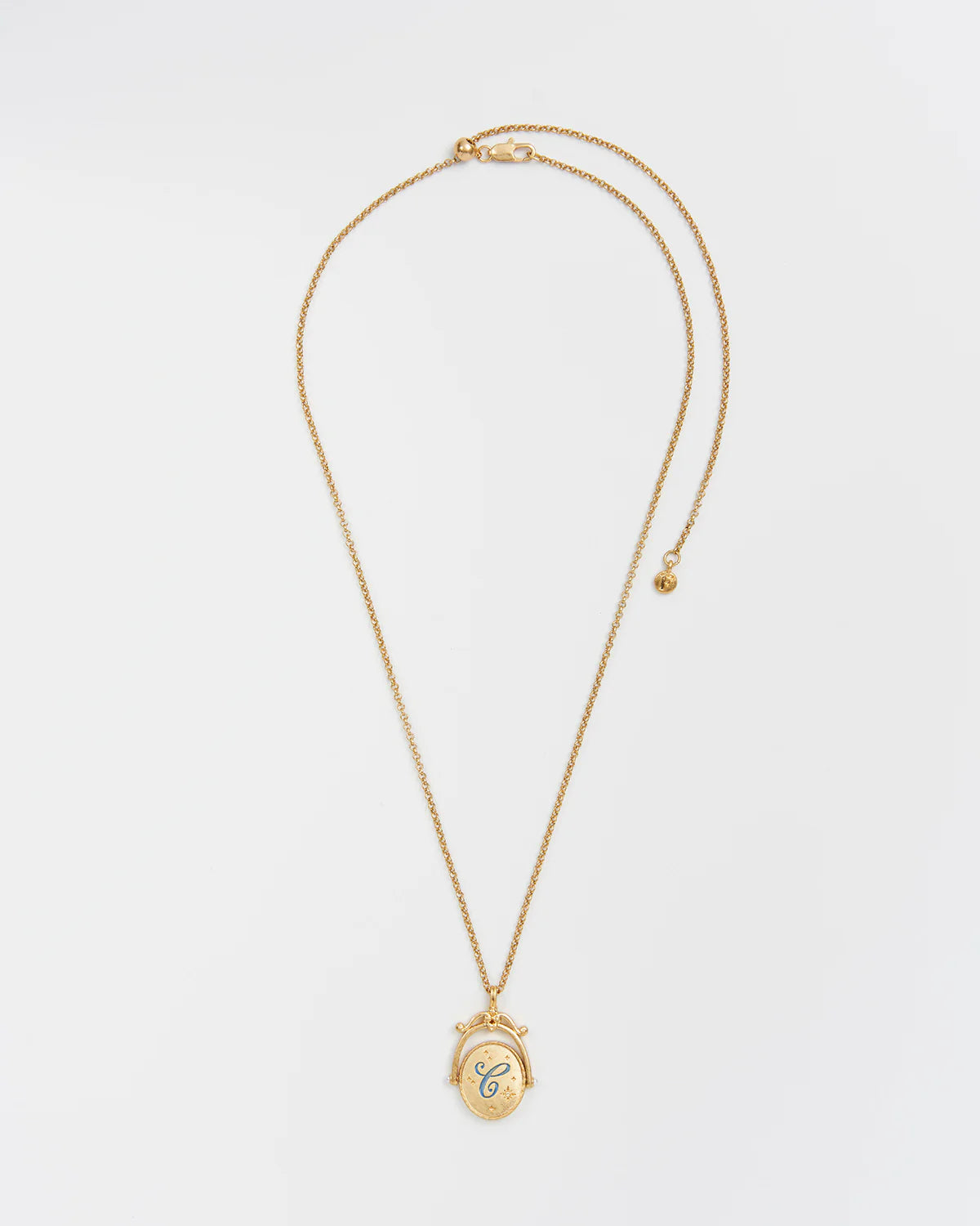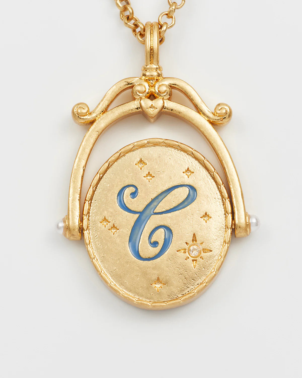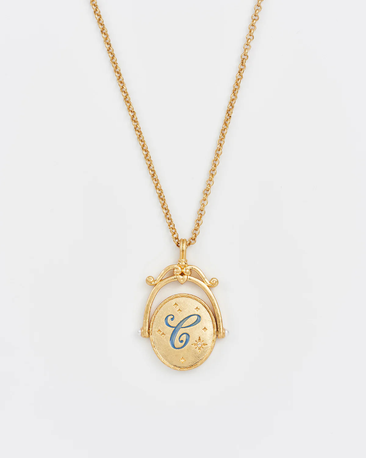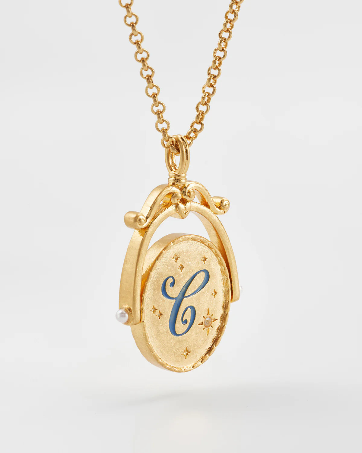 Kétoldalas medál: az egyik oldalán egy klasszikus írott 'C' kezdőbetű, a másikon egy finoman kézzel festett búzavirág – a tisztaság és a remény szimbóluma – látható. A sokoldalúságot szem előtt tartva tervezett nyaklánc levehető medállal és állítható lánccal rendelkezik.