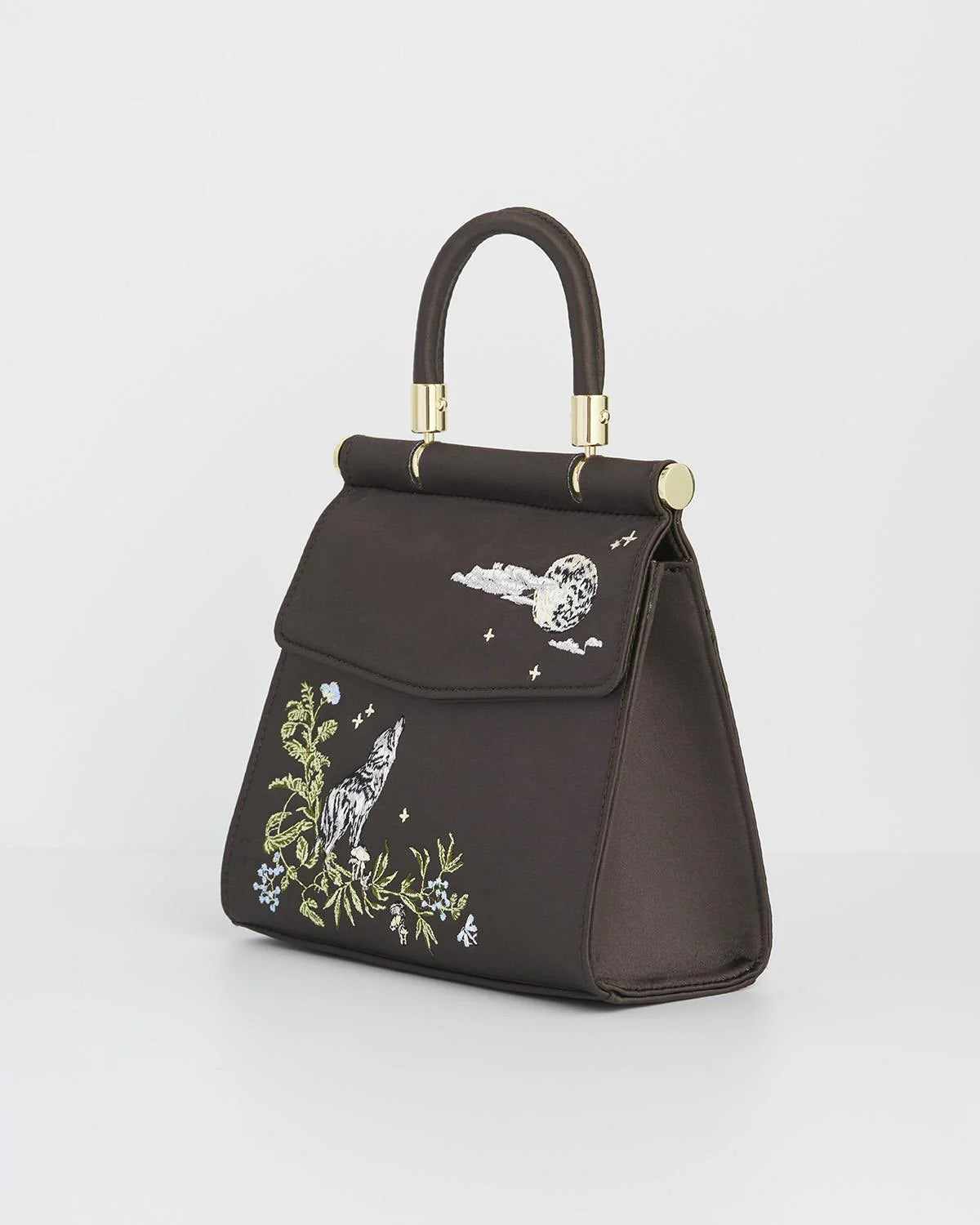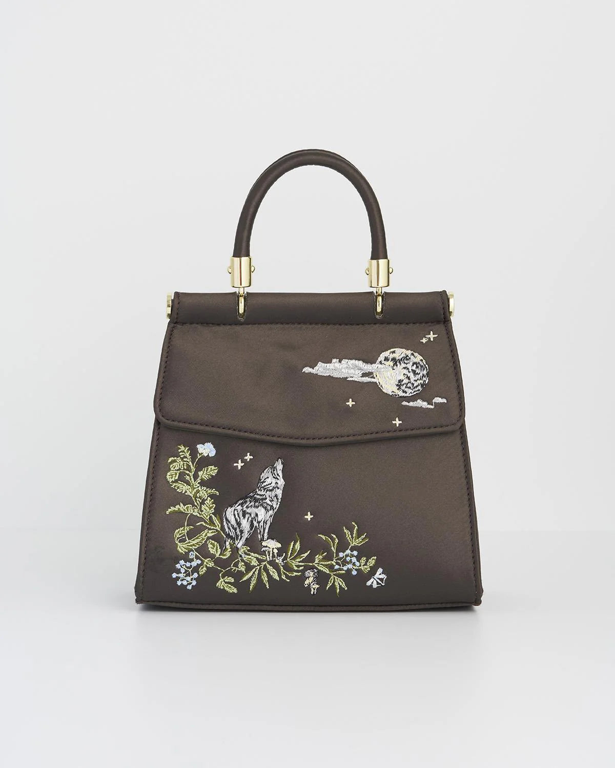 A bonyolult, hímzett farkas és hold motívummal díszített, fényűző, sötétszínű szatén rejtélyt és kifinomultságot áraszt. Az állítható aranyszínű lánc egy csipenyti kifinomultságot ad minden összeállításhoz és sokoldalúságot biztosít ahhoz, hogy kényelmesen viselhesd a válladon vagy oldaltáskaként is.