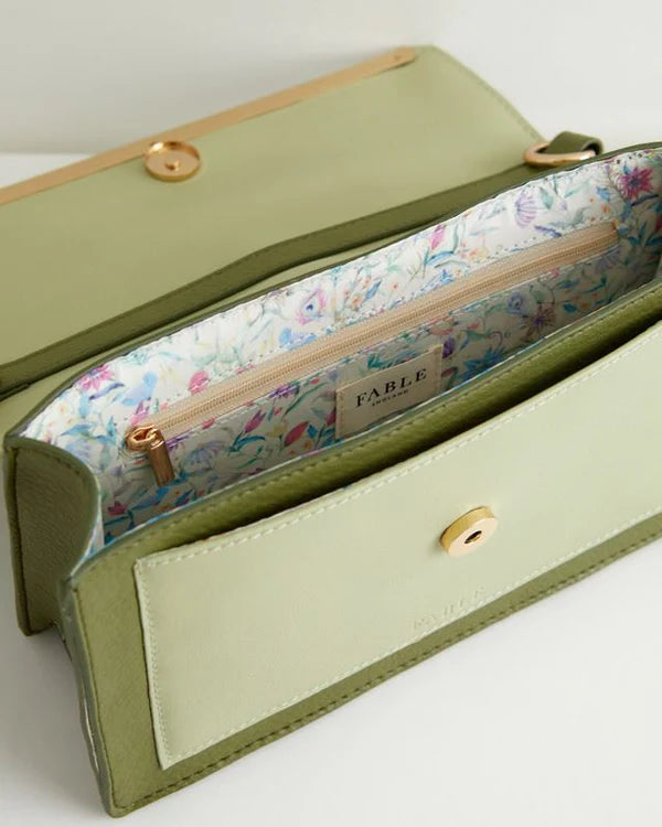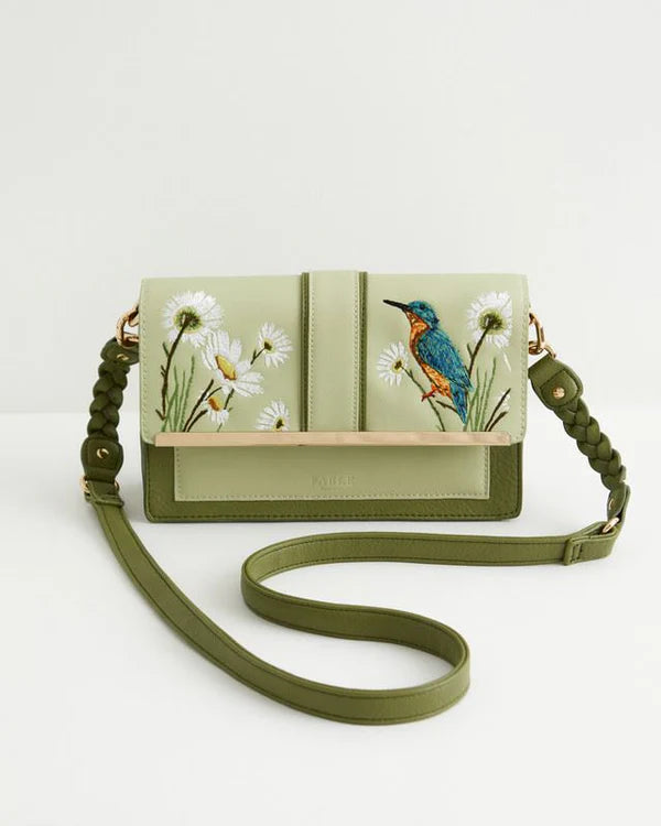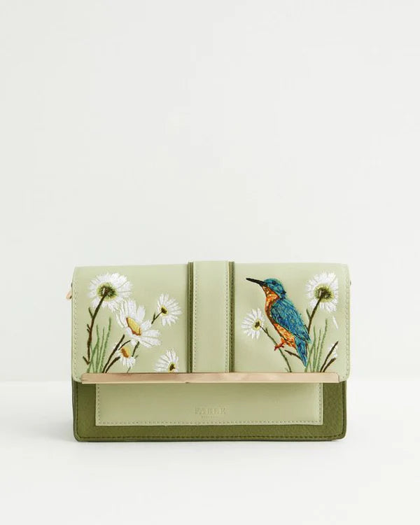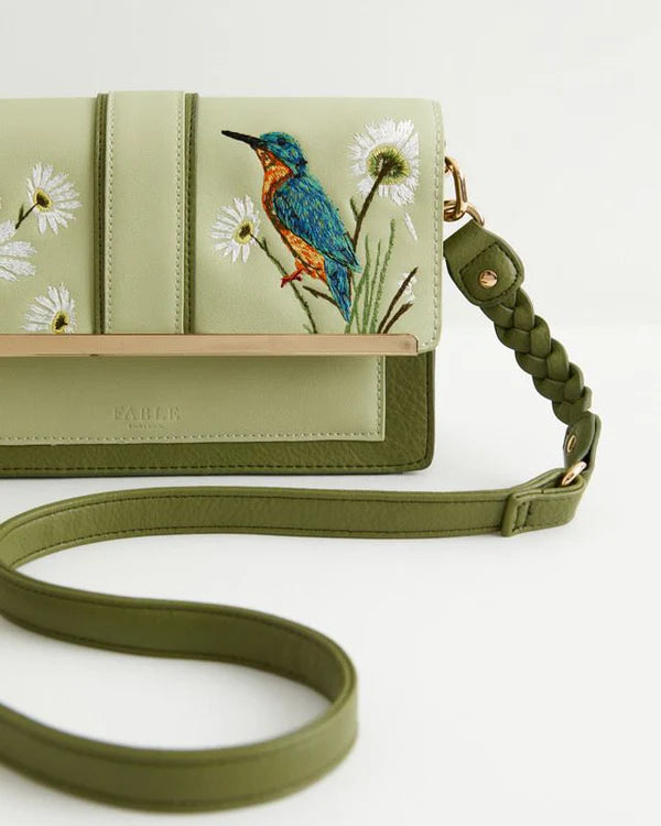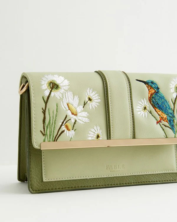 Ez az elegáns zöld oldaltáska újrahasznosított anyagokból készült. A vadvirágok között ülő jégmadaras hímzés, a pántok fonott kis részletei és arany tónusú kiegészítők teszik igazán bájossá, különlegessé. A jégmadár a nőiség, a szabadság, a bátorság, a kaland és az egyensúly jelképe.