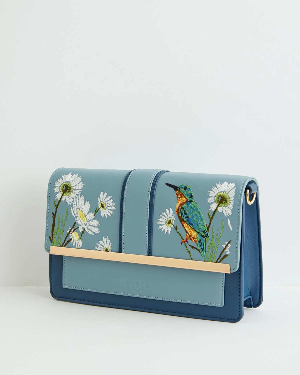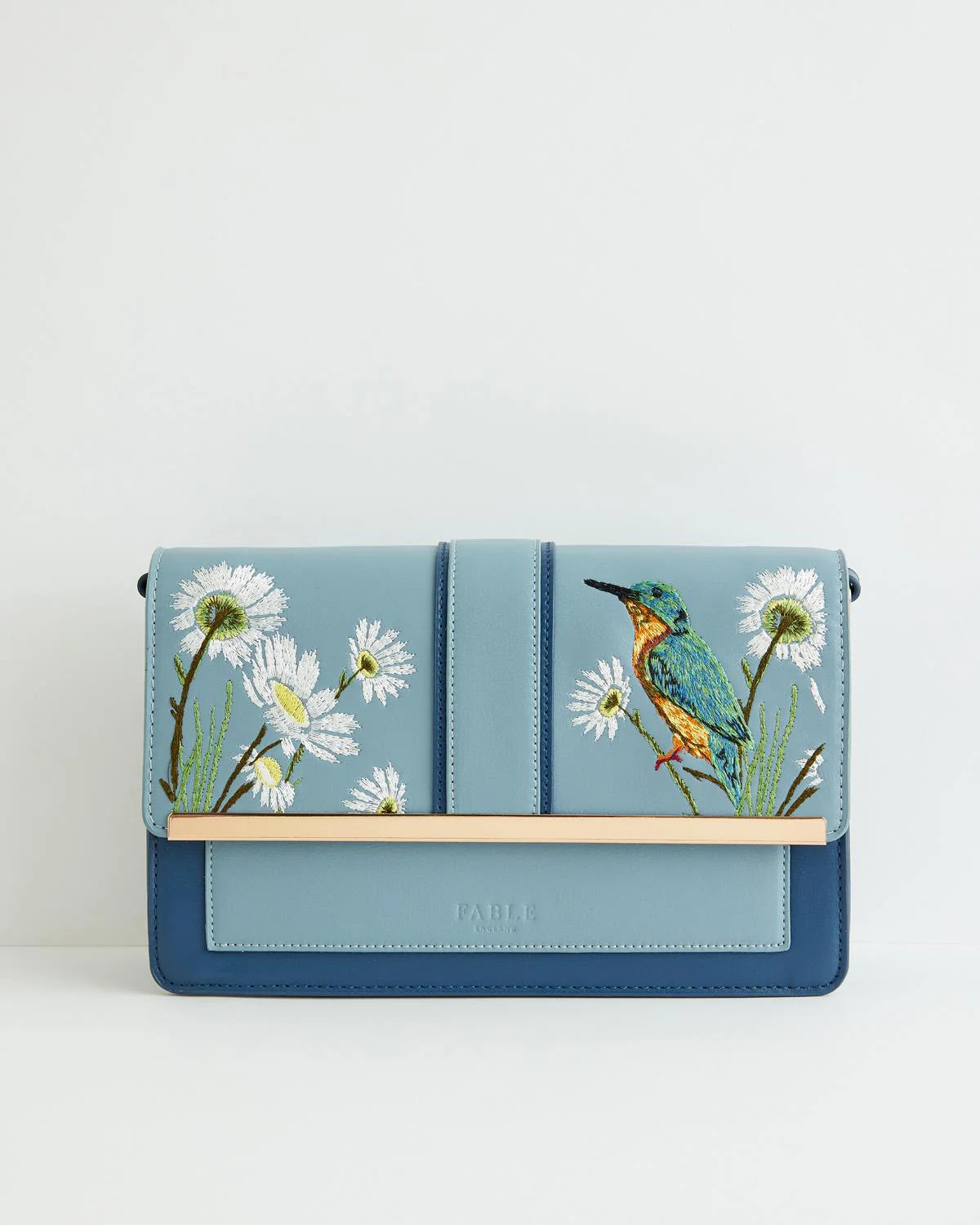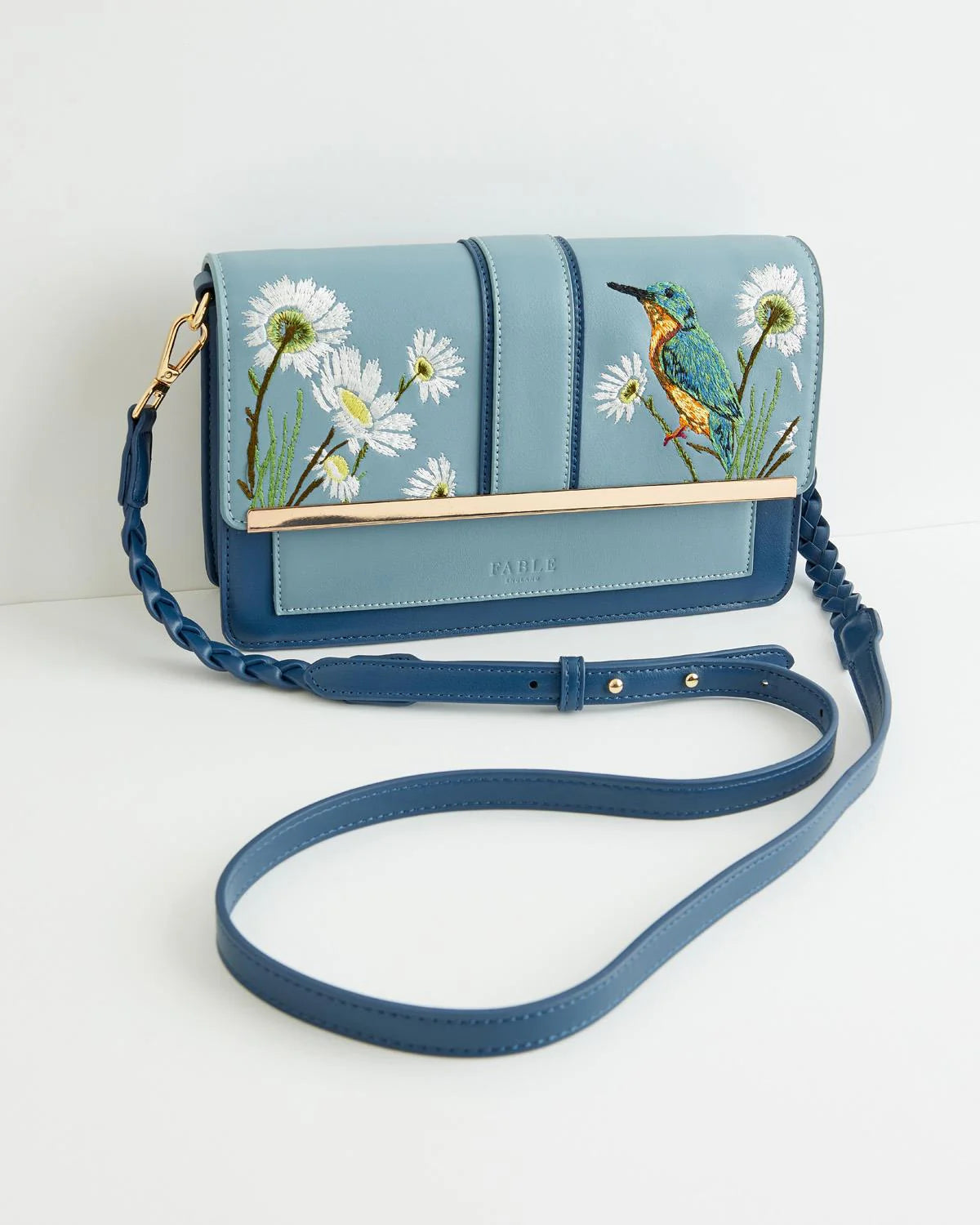Ez az elegáns kék színű oldaltáska újrahasznosított anyagokból készült. A vadvirágok között ülő jégmadaras hímzés, a pántok fonott kis részletei és arany tónusú kiegészítők teszik igazán bájossá, különlegessé. A jégmadár a nőiség, a szabadság, a bátorság, a kaland és az egyensúly jelképe.