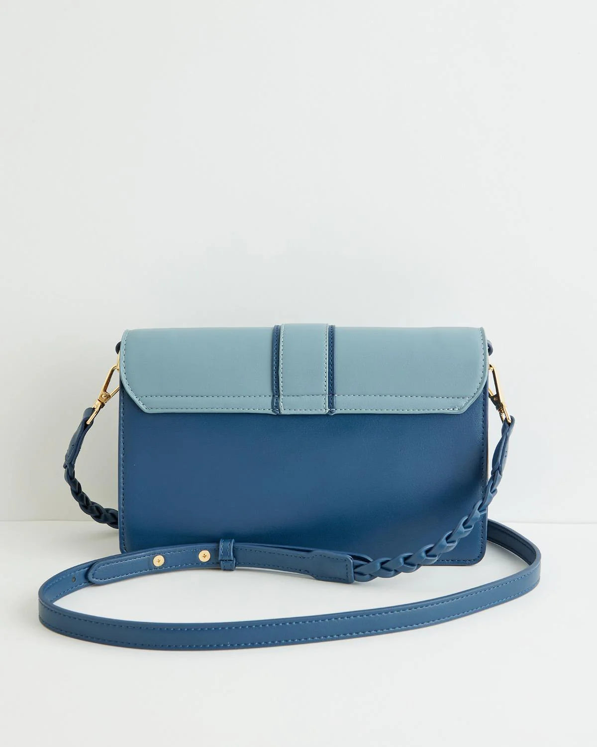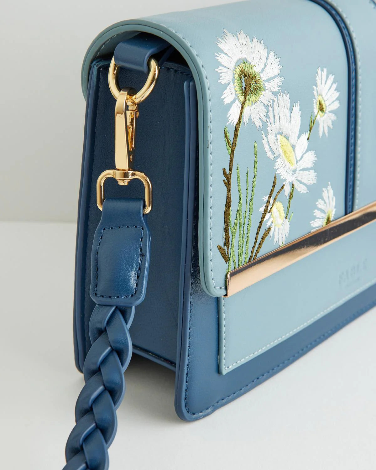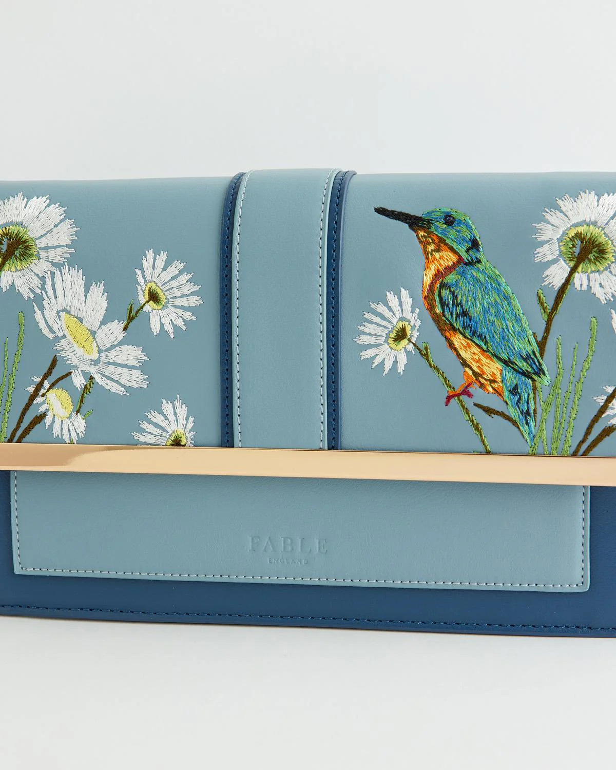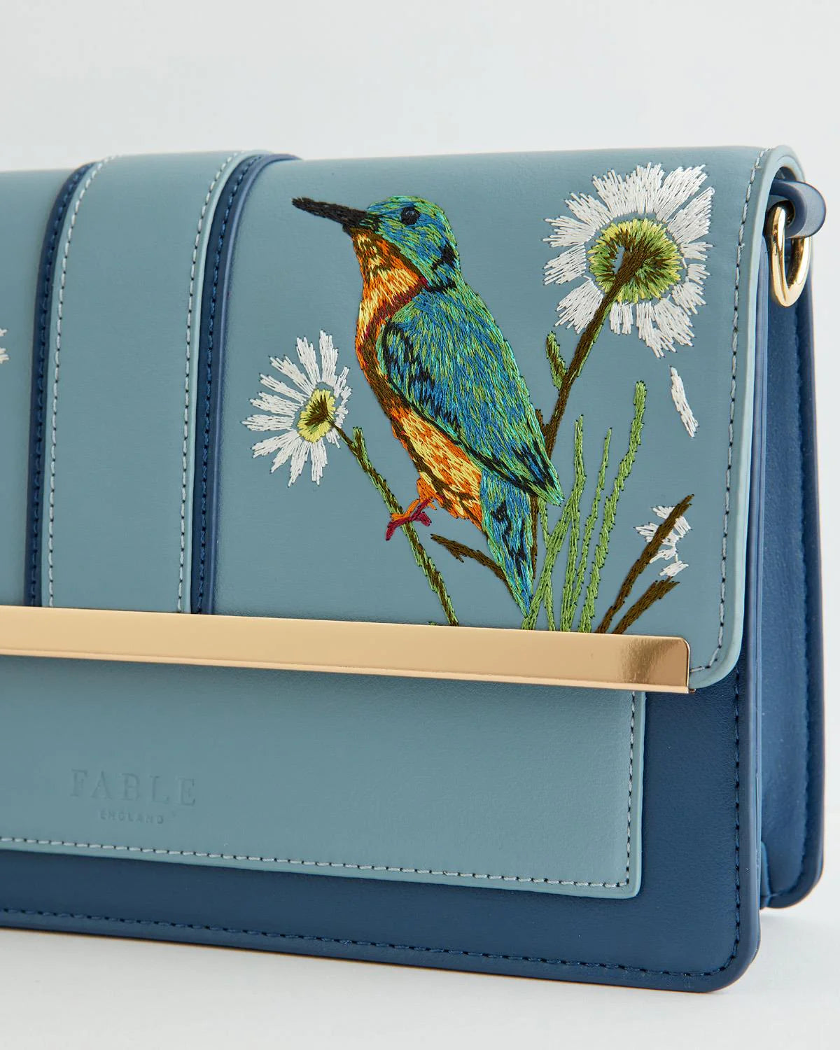 Ez az elegáns kék színű oldaltáska újrahasznosított anyagokból készült. A vadvirágok között ülő jégmadaras hímzés, a pántok fonott kis részletei és arany tónusú kiegészítők teszik igazán bájossá, különlegessé. A jégmadár a nőiség, a szabadság, a bátorság, a kaland és az egyensúly jelképe.