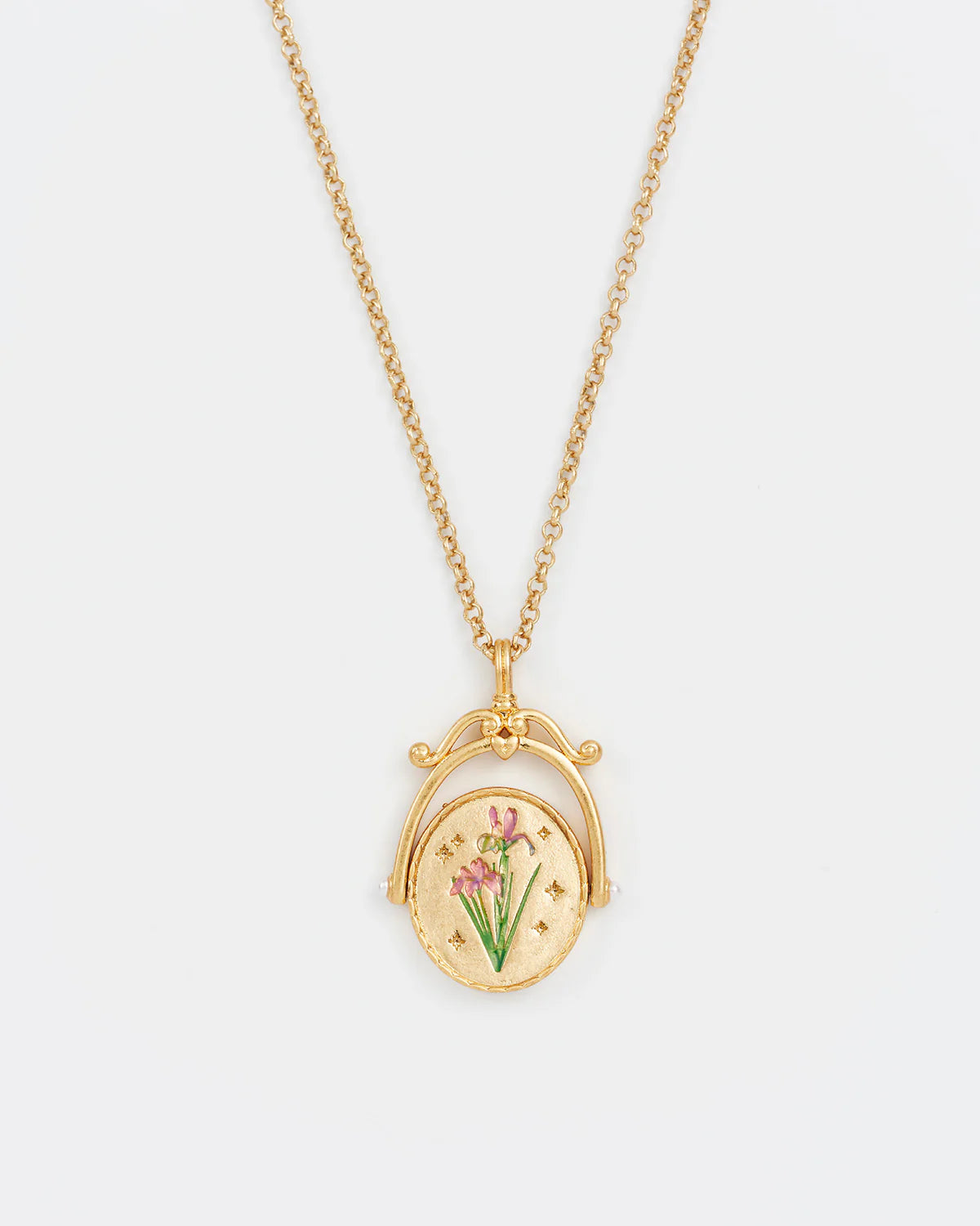 Kétoldalas medál: az egyik oldalán egy klasszikus írott 'I' kezdőbetű látható, a másikon egy finoman kézzel festett írisz látható, amely a bátorságot és a bölcsességet jelképezi. A sokoldalúságot szem előtt tartva tervezett nyaklánc levehető medállal és állítható lánccal rendelkezik.