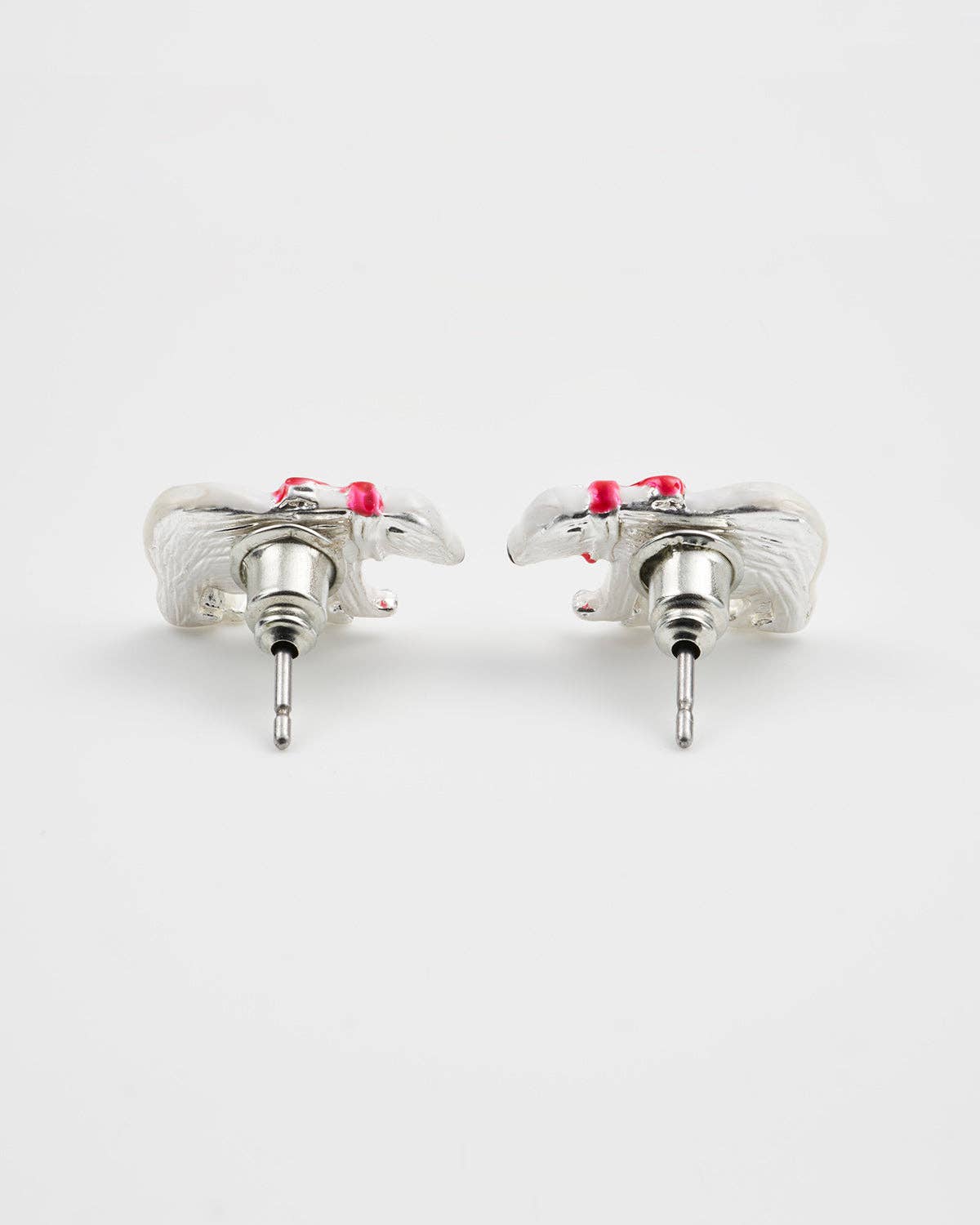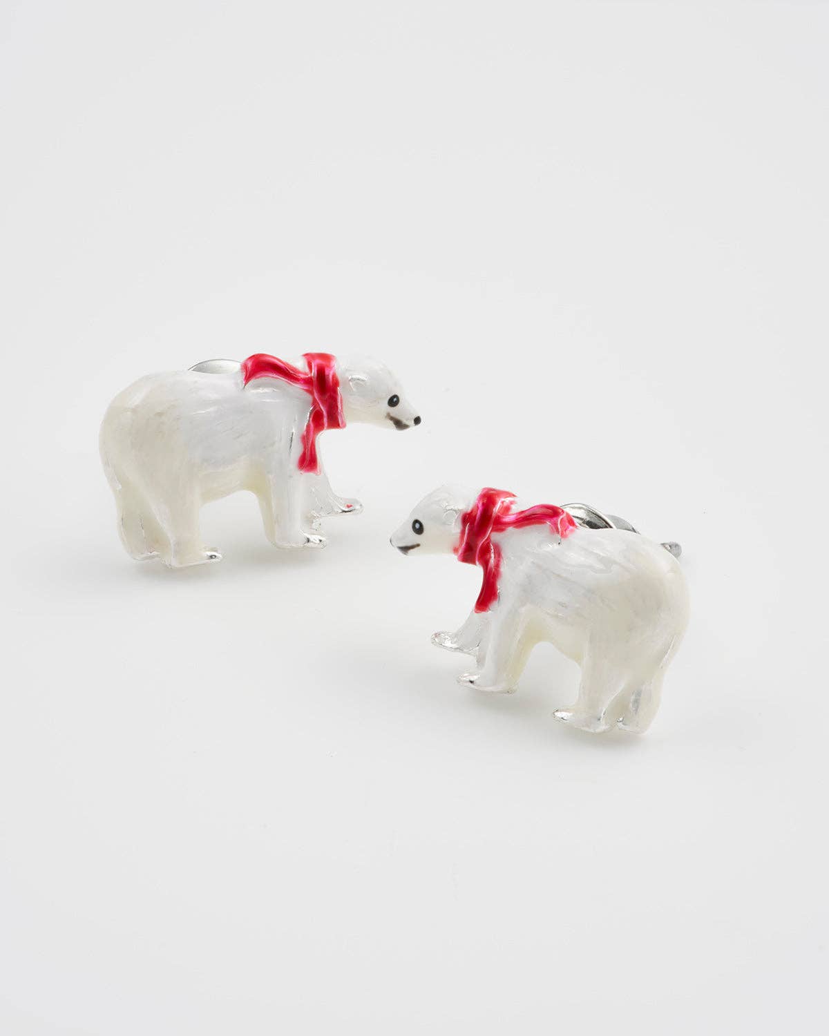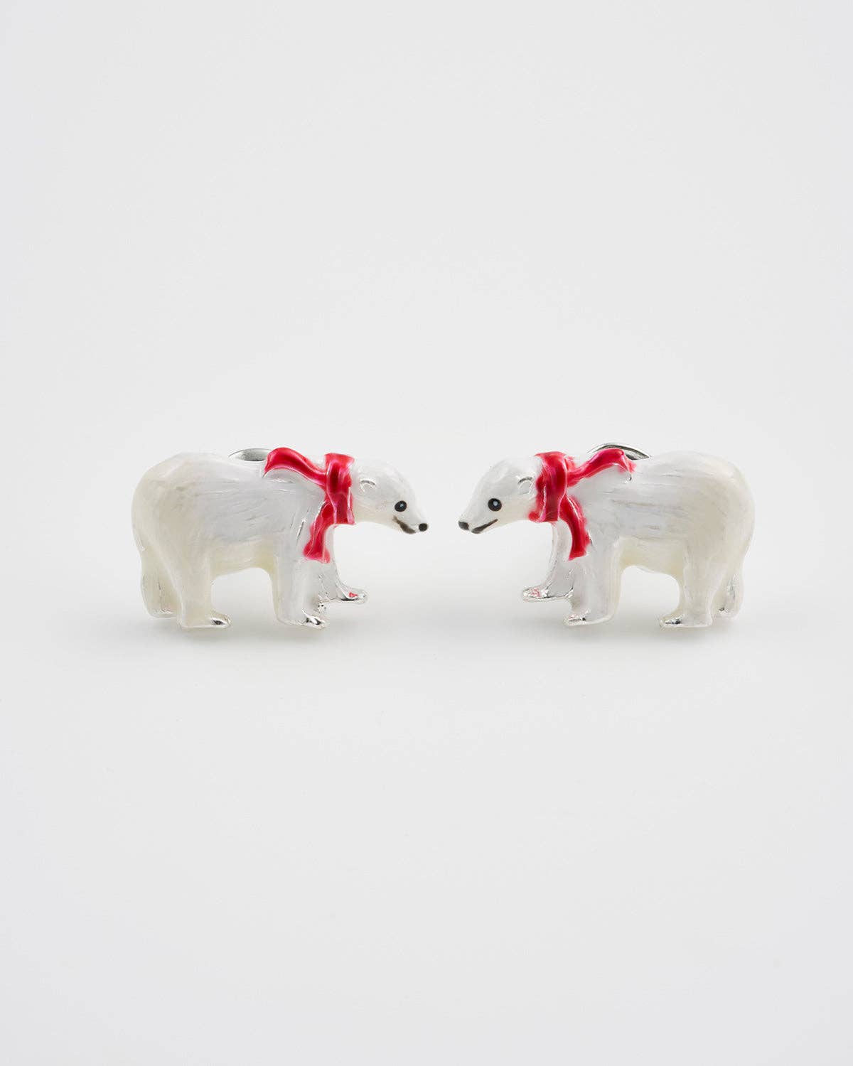 A kézzel festett, zománcozott fülbevalók egy-egy fenséges jegesmedvét ábrázolnak, csillogó ezüst és fehér árnyalatokban, mélyvörös sállal, egy picike meleg puhaságba burkolózva. Kiegyensúlyozott, elmélkedő testtartásuk a tél szépségét és a fehér csendben rejlő erőt tükrözik.