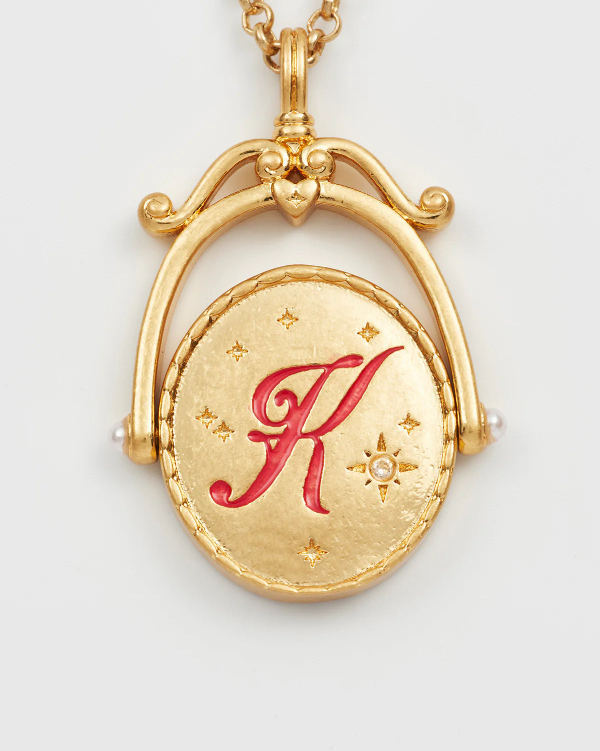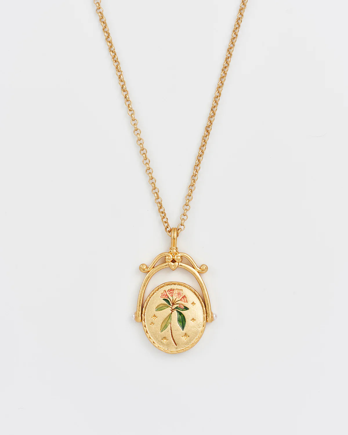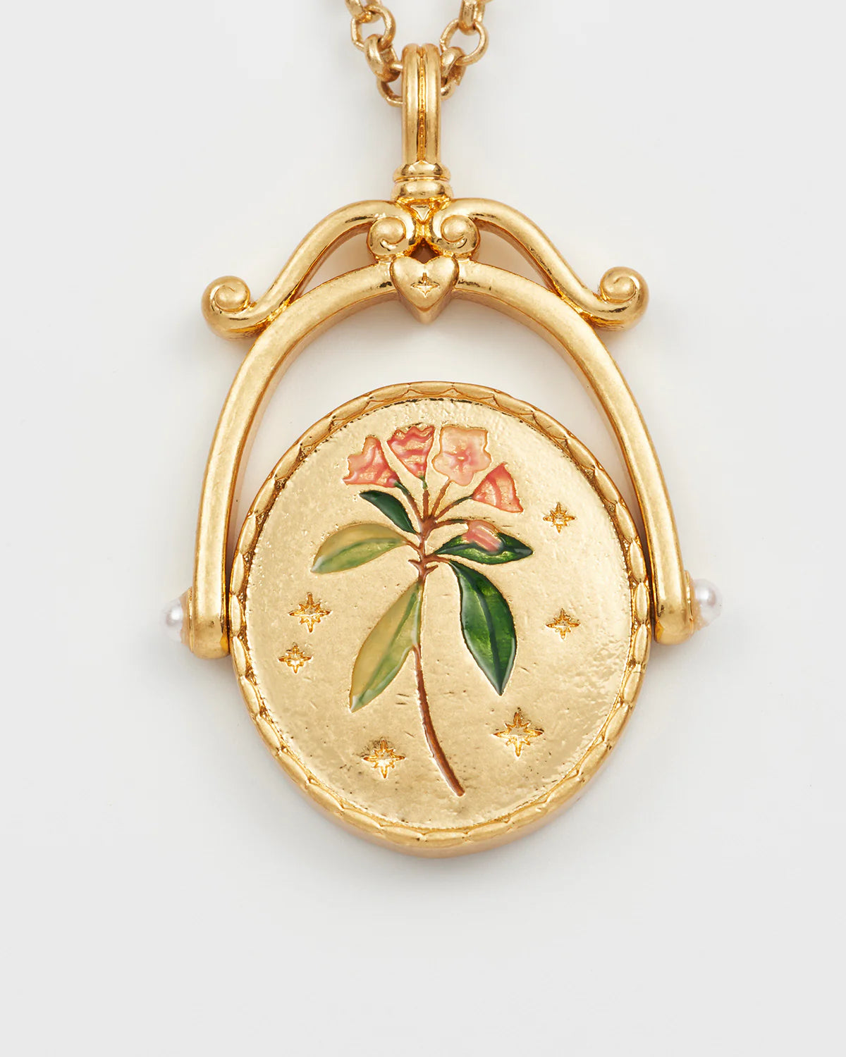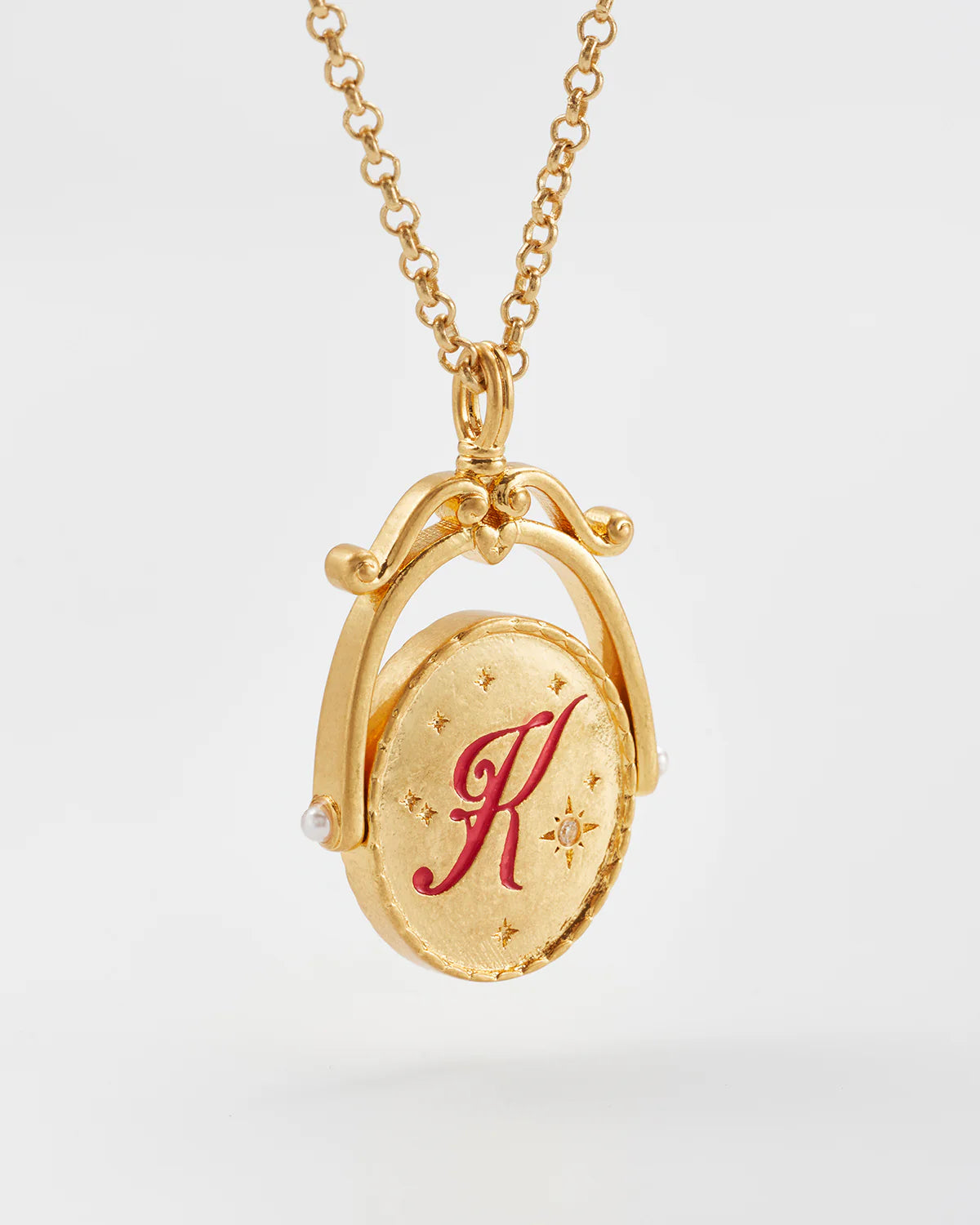 Kétoldalas medál: az egyik oldalán egy klasszikus írott 'K' kezdőbetű látható, a másikon egy finoman kézzel festett kalmia virág látható, amely a szenvedélyt és az energiát jelképezi. A sokoldalúságot szem előtt tartva tervezett nyaklánc levehető medállal és állítható lánccal rendelkezik.