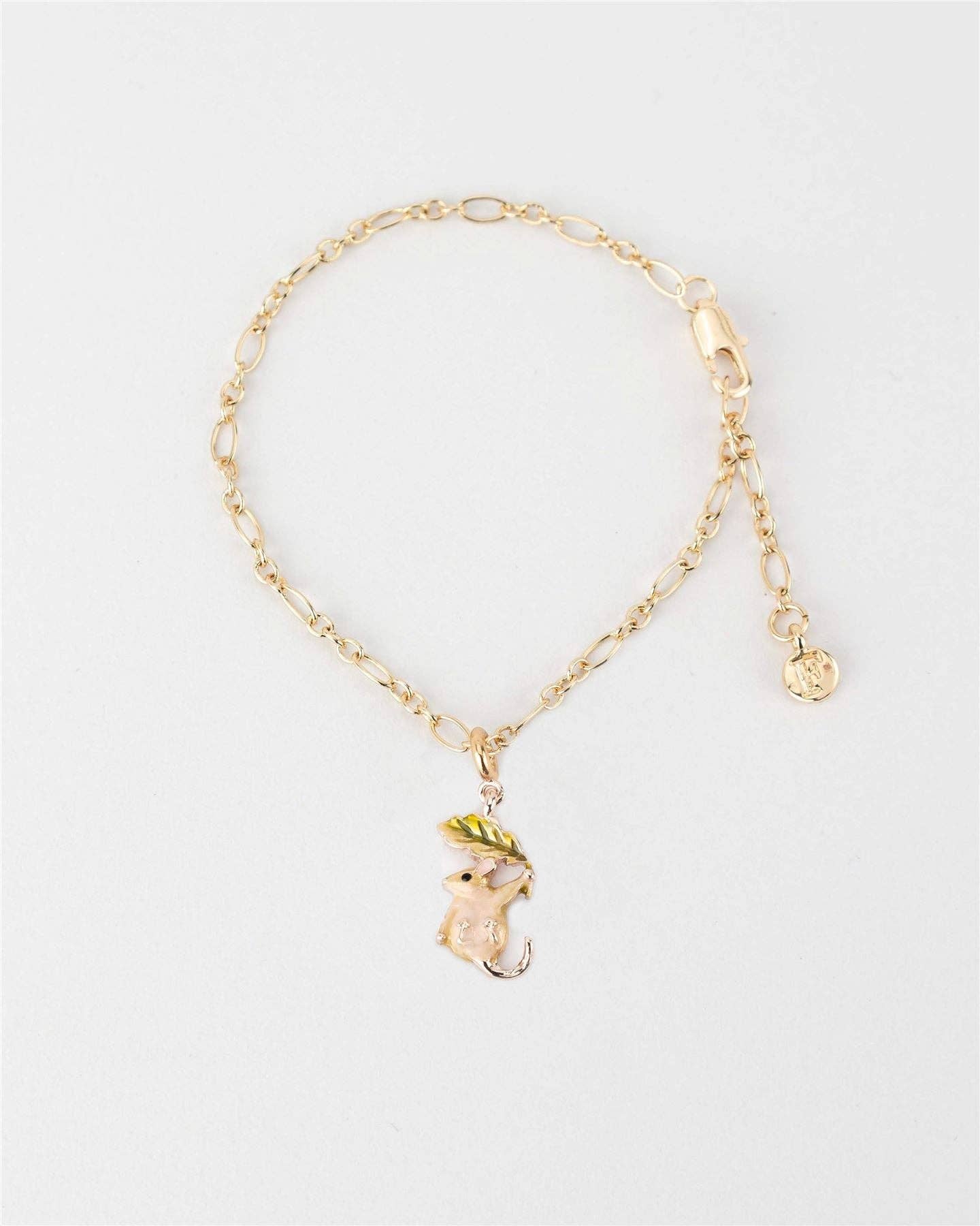 A karkötő a legnépszerűbb charmunkkal érkezik, tüneményes kis mogyorós pele díszíti a gyönyörű aranyozott láncot. A lánc és a charm színe is rózsaarany.