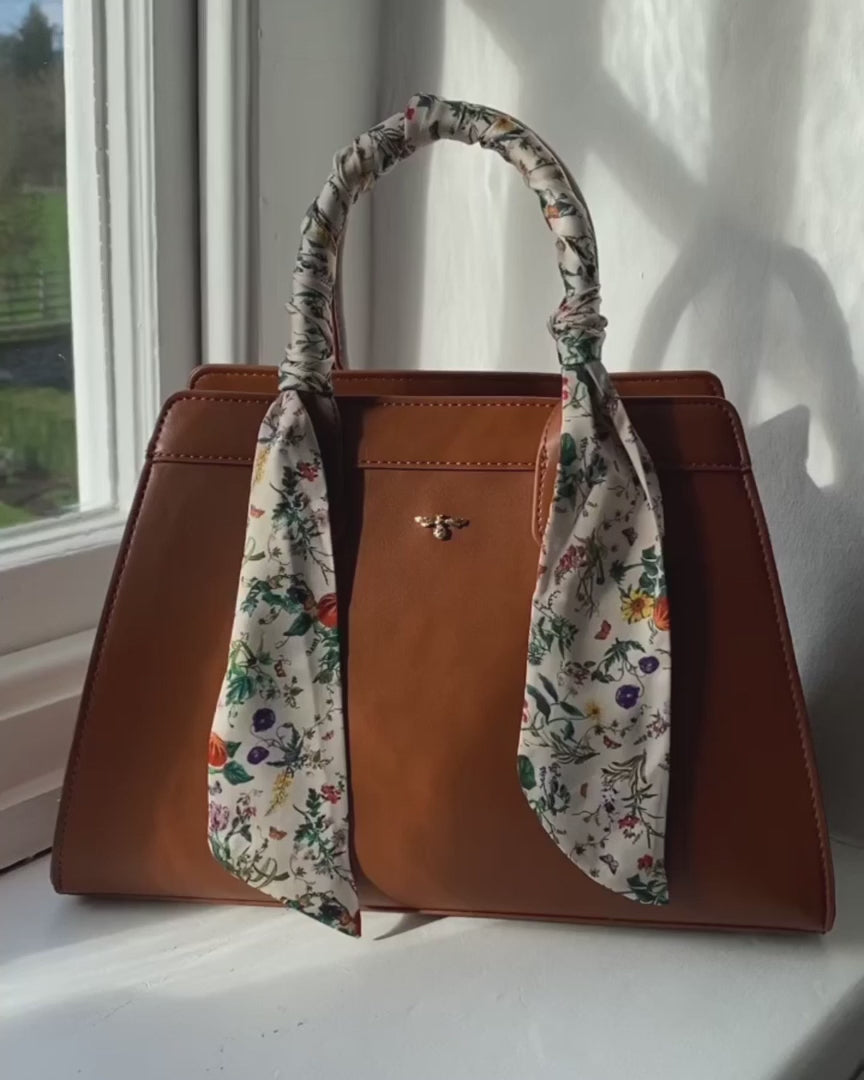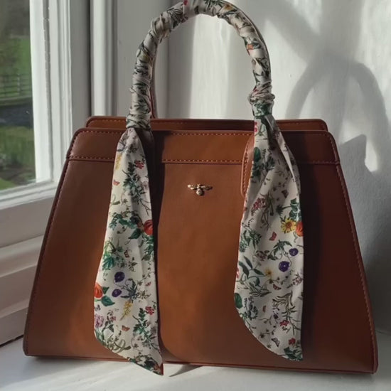 Elegáns táskánk elbűvölő őszi növény-, és tökmintával bélelt, melynek fogantyúját egy selymes, pamut sál díszíti. Váltogasd a kézitáska és az oldaltáska funkciót, hogy feldobd a megjelenésedet és megbízható társad lehessen bármely alkalomra!