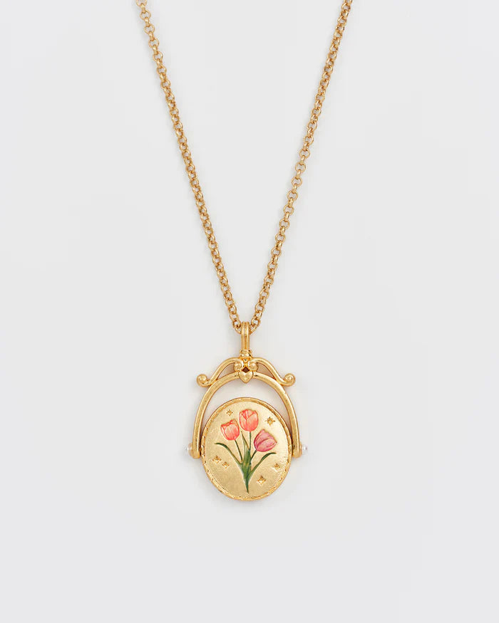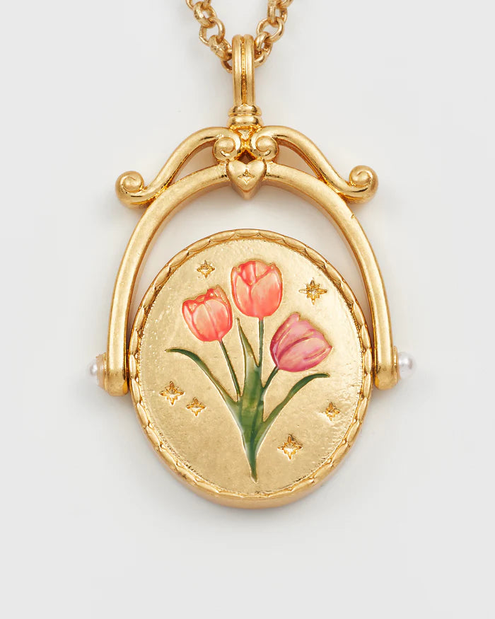 Kétoldalas medál: az egyik oldalán egy klasszikus írott "T' kezdőbetű látható, a másikon finoman kézzel festett tulipán látható, a szépség és a szeretet szimbóluma. A sokoldalúságot szem előtt tartva tervezett nyaklánc levehető medállal és állítható lánccal rendelkezik.