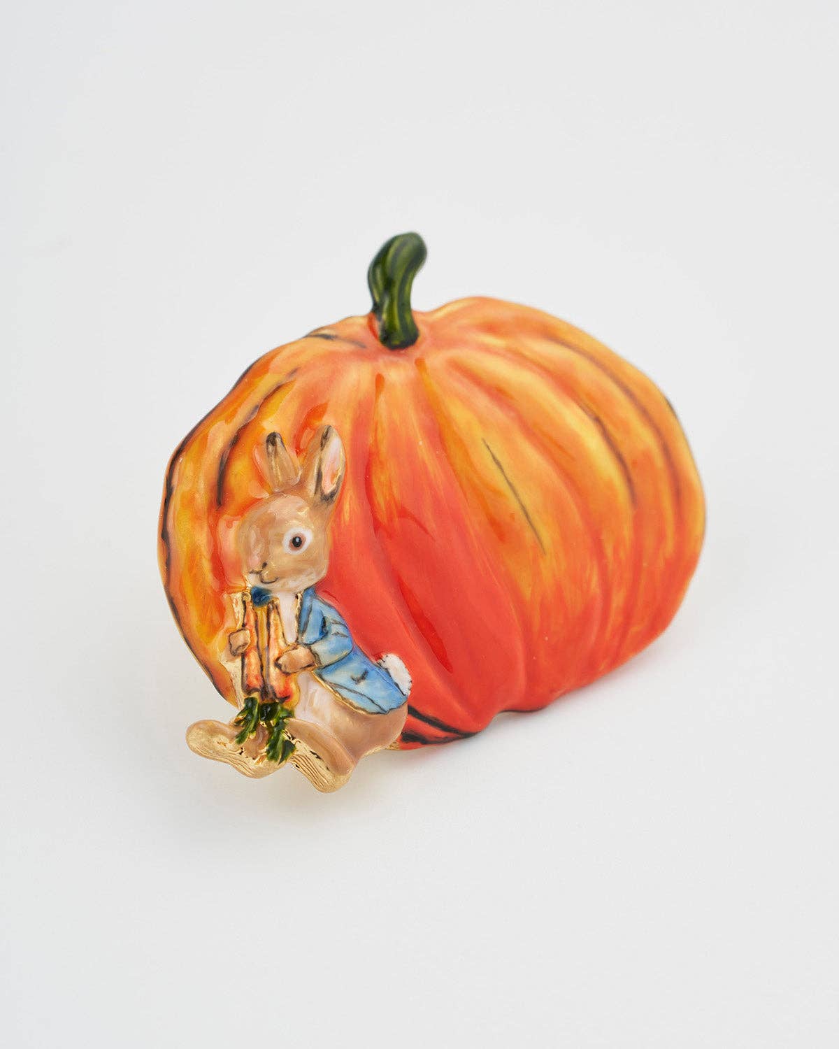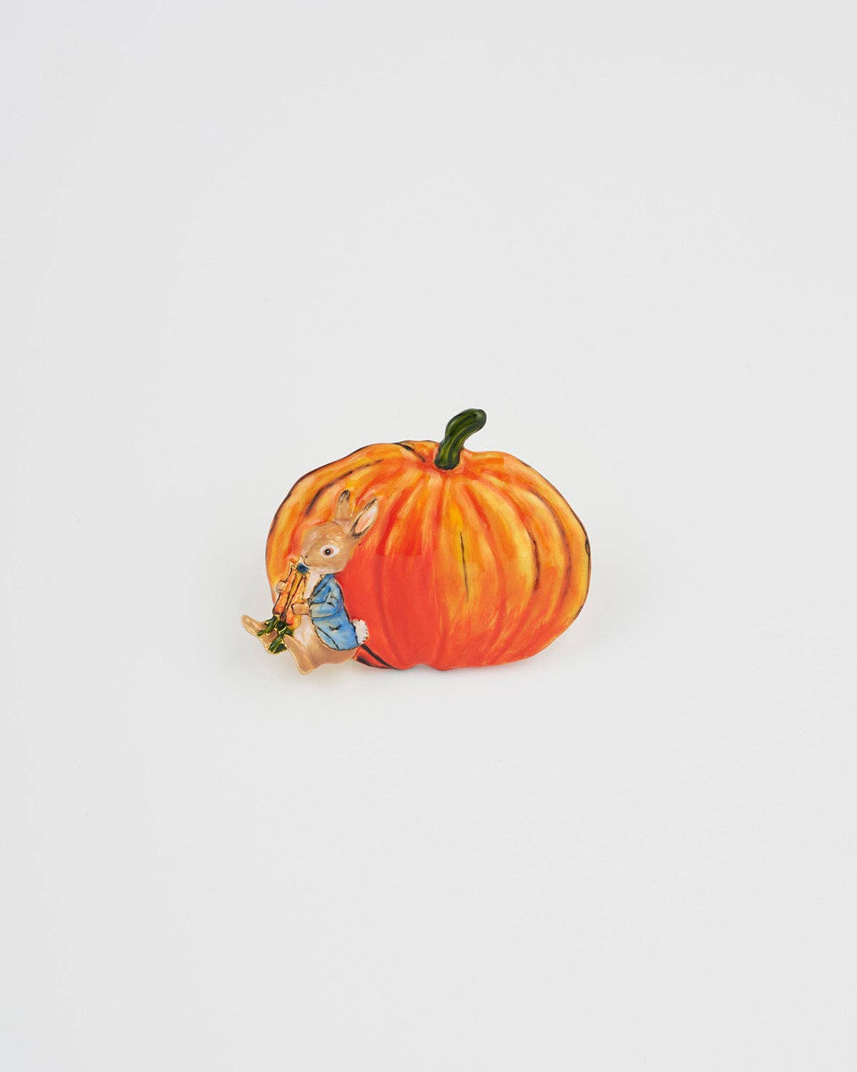 Az exkluzív Fable England x Nyúl Péter limitált őszi kollekció része ez az különleges Nyúl Péter bross, amely az évszaknak megfelelően egy óriási őszi tök mellett répával a kezében pihengető nyuszit ábrázol.