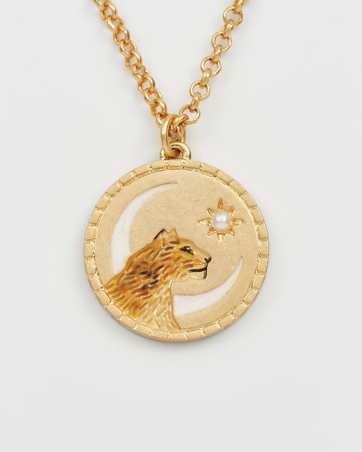 A kézzel festett, gazdag zománccal és 22 karátos kopott arannyal díszített nőstény oroszlán egy ragyogó Hold előtt pihen, tekintete vad, mégis gondoskodó. Egy finom gyöngydíszítés teszi teljessé a darabot, amely egy csipetnyi plusz csillogást is ad ennek a szépséges és jelentőségteljes ékszernek.