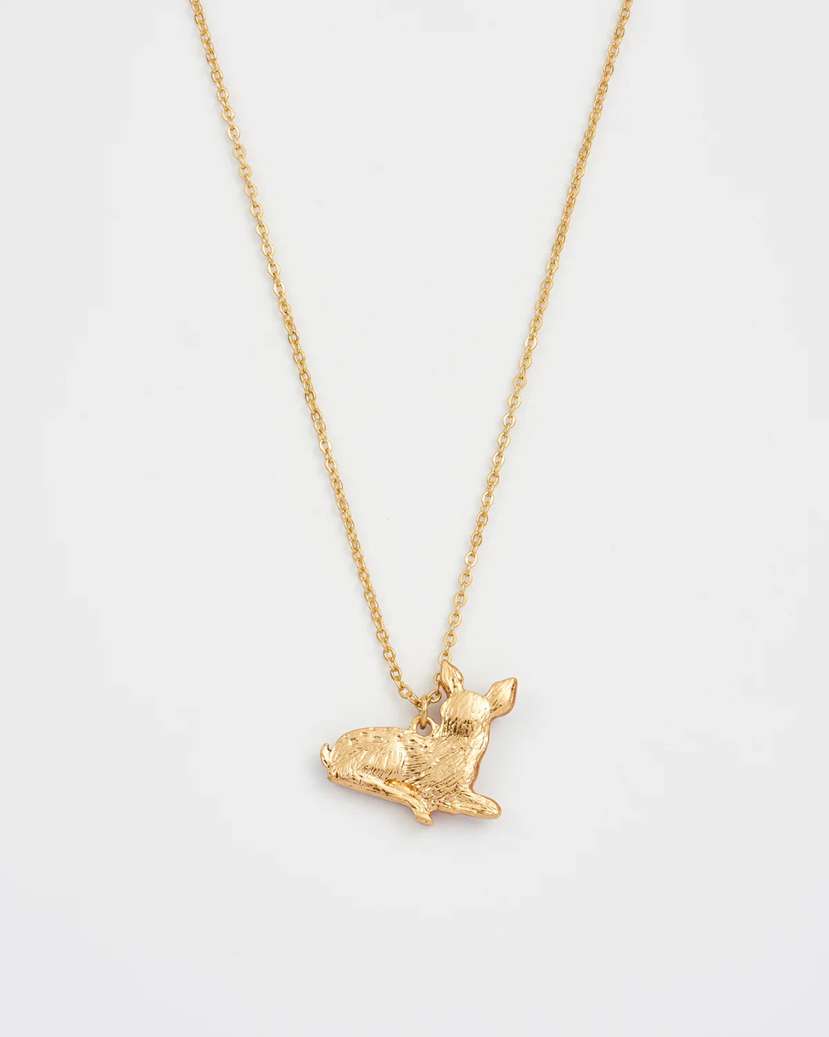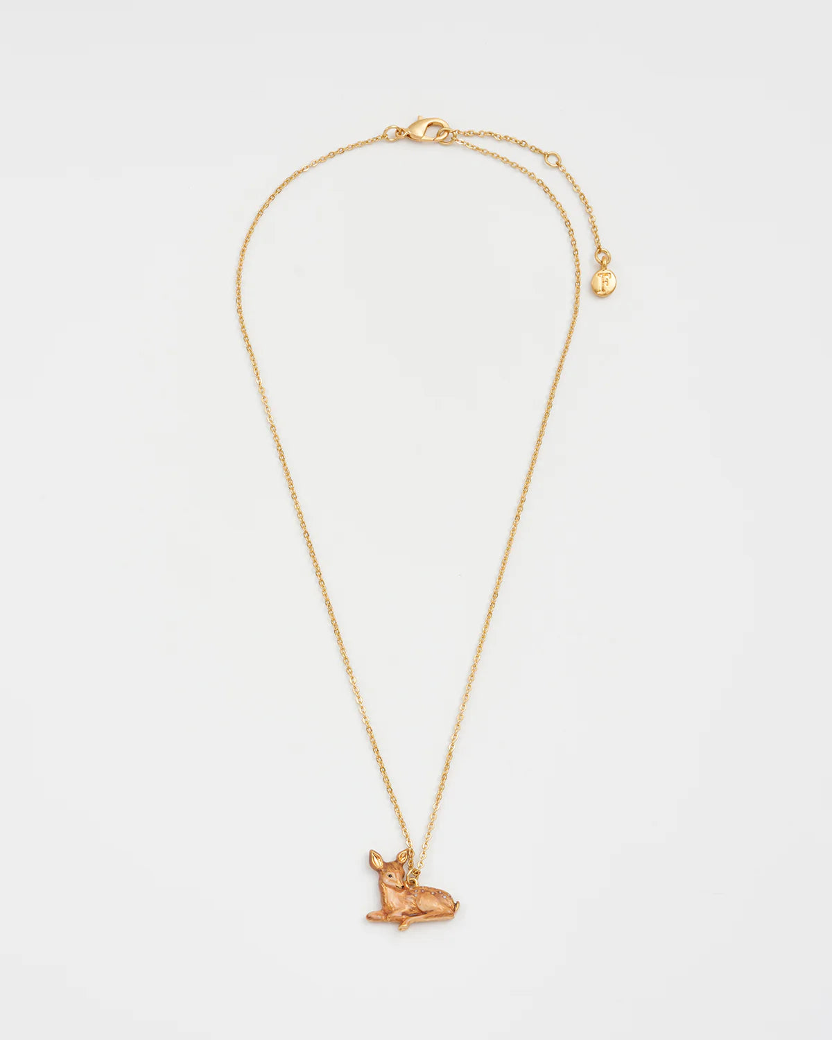 A 22 karátos koptatott aranyozású sárgarézből szeretettel készített, kézzel festett zománc részletekkel díszített medál egy pihenő őzgidát ábrázol – egy békés, figyelmes és ártatlanságtól ragyogó kis élőlényt.