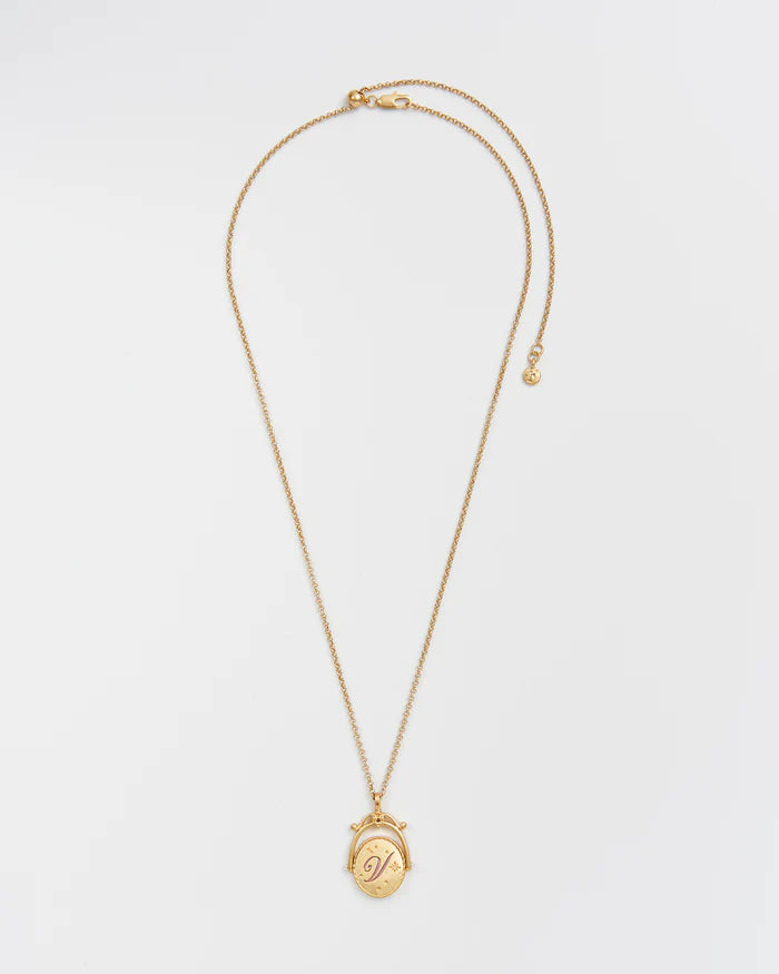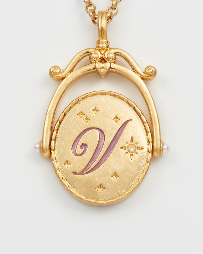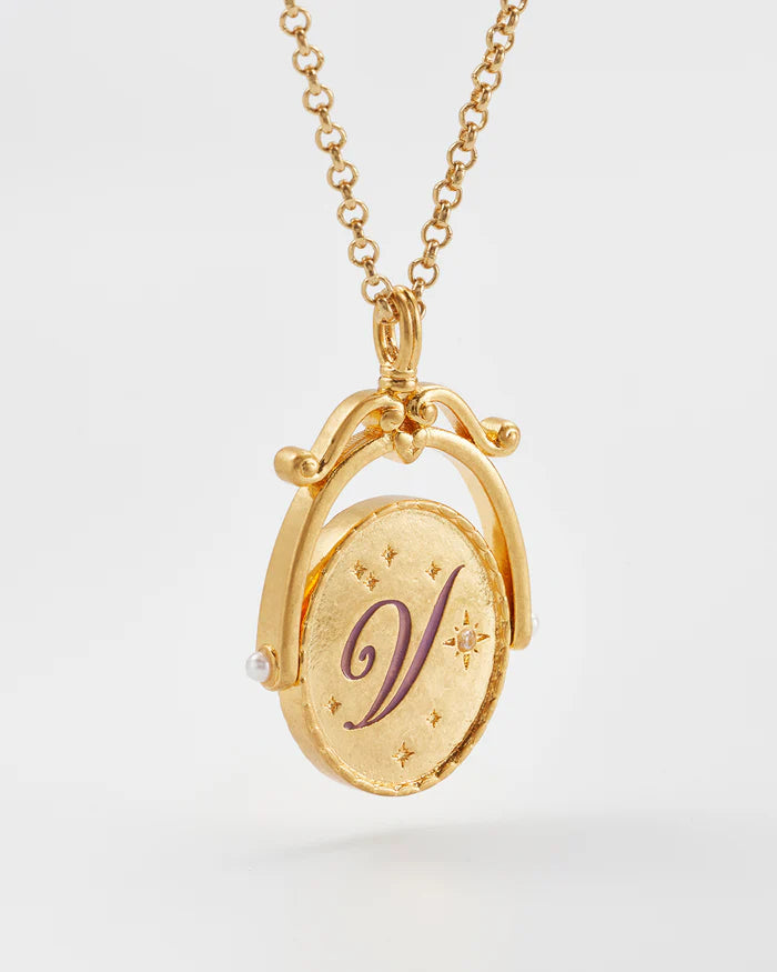 Kétoldalas medál: az egyik oldalán egy klasszikus írott "V" kezdőbetű látható, a másikon finoman kézzel festett ibolya látható, a szerénység és a szeretet szimbólum. A sokoldalúságot szem előtt tartva tervezett nyaklánc levehető medállal és állítható lánccal rendelkezik.