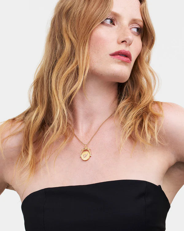 Ez a vintage stílusú aranyozott nyaklánc forgatható medállal egy különleges darab, amely jelentőségteljes ajándék vagy személyes emléktárgy lehet annak, aki viseli.