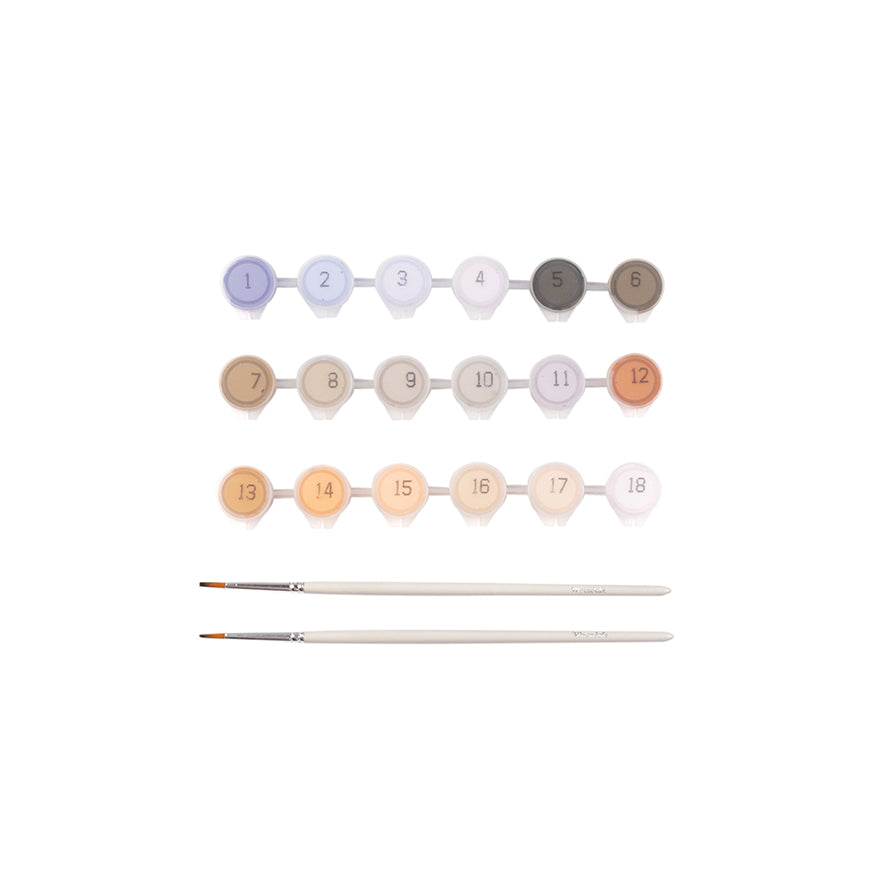 - Tartalom: előrajzolt vászon, akrilfesték készlet a szükséges árnyalatokkal, ecsetek, útmutató